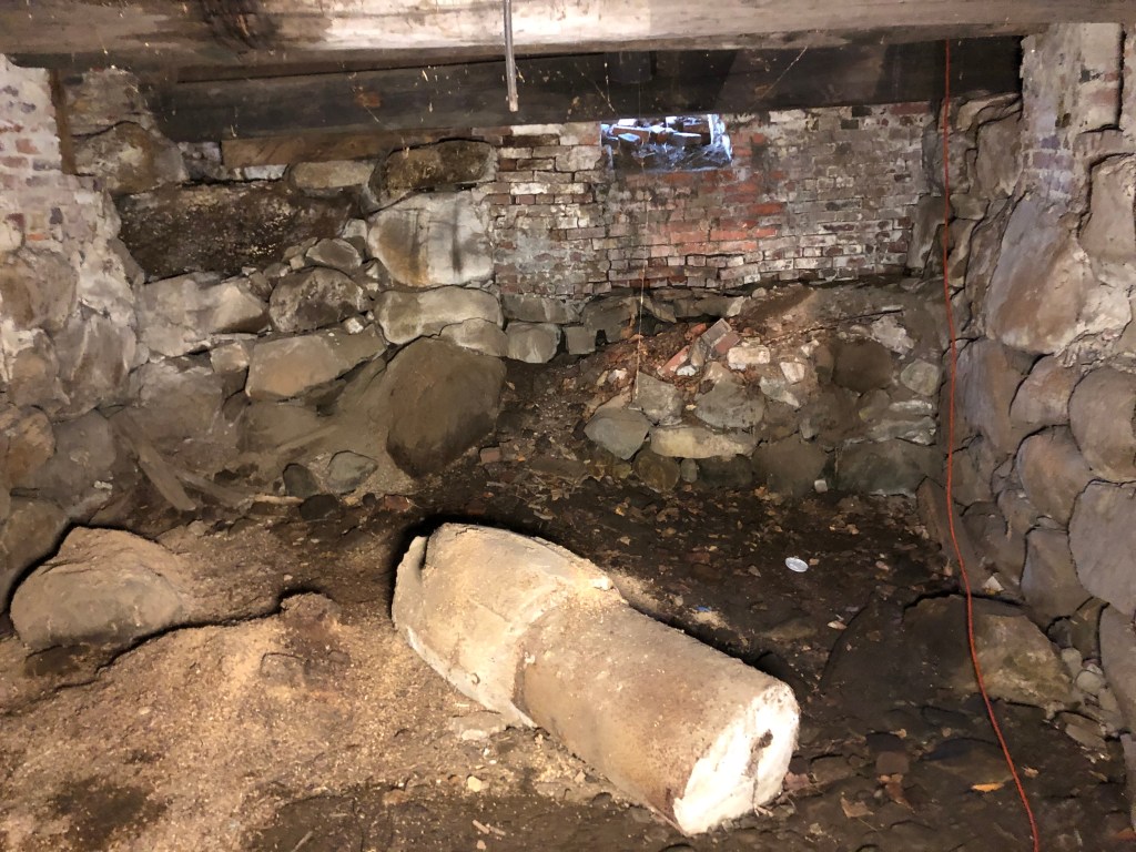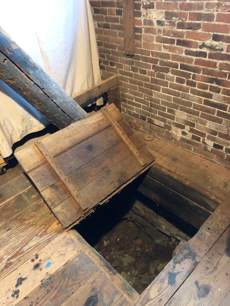 … and probably ran along a wooden channel to the top of a water wheel mounted near the back of the Mill. We believe the top half of the wheel would have been been visible in current cellar area, with the other half extending down into a large channel beneath the cellar, what we today call “the wheel pit.”