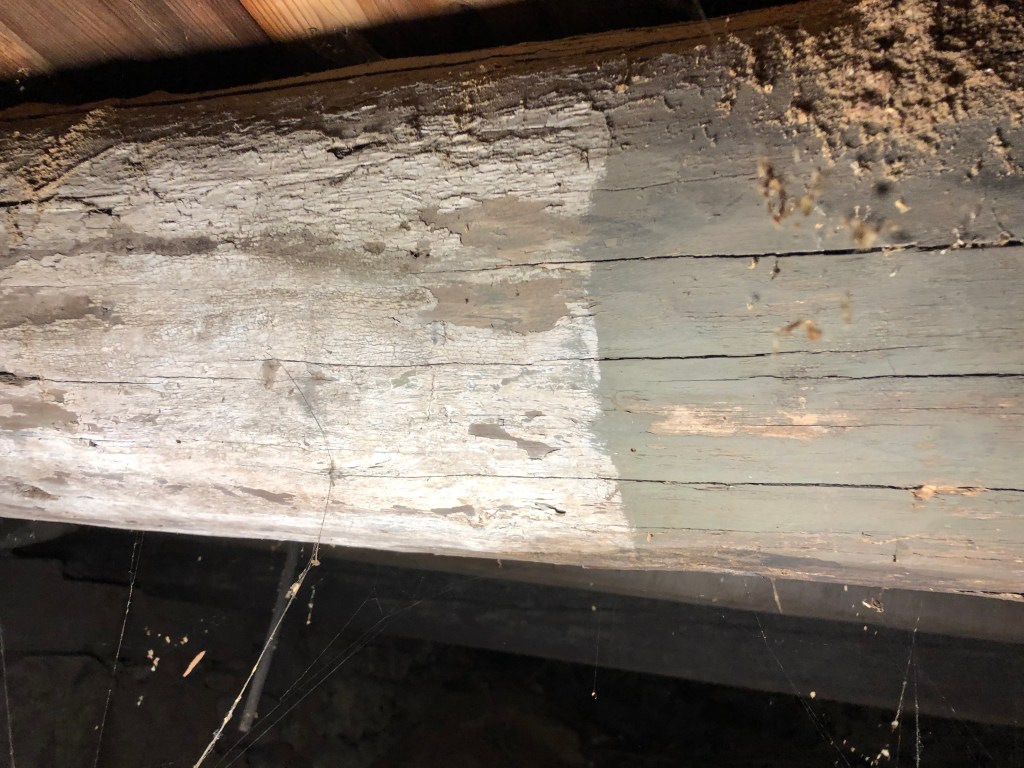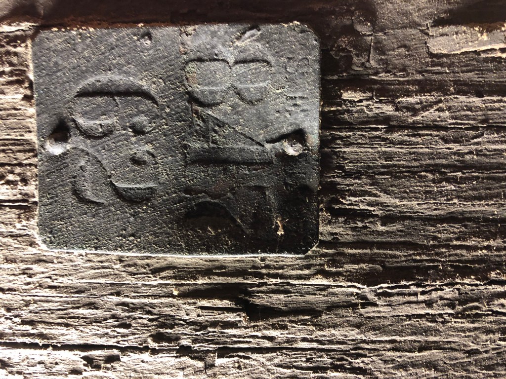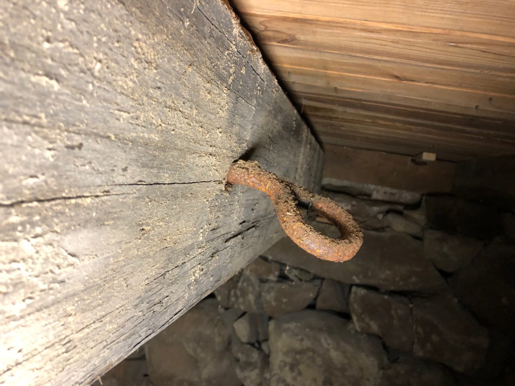 Massive beams cross the top of the wheel pit, supporting the cellar floor above. The timbers bear markings and some evidence of having served other purposes before being laid across the pit. Clockwise from top left: a large screw eye; hand and foot holds for climbing; a section of a beam painted white; a metal stamp with numbers.