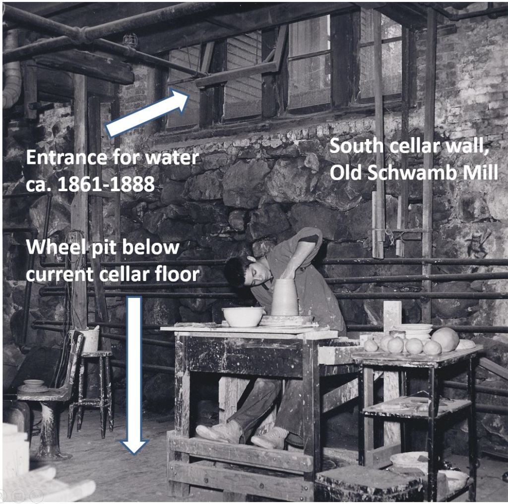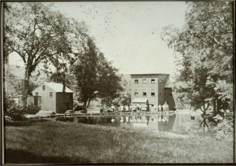 - 1864 The Schwambs purchased the Mill with a working water wheel. Photographs from the 1860s and 1870s show the channel leading from the pond in front of the Mill to the center of the Mill, suggesting that the wheel was mounted within the building, in the center, at or below cellar level. Water exited the back of the building and into Mill Brook.