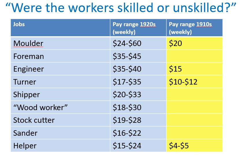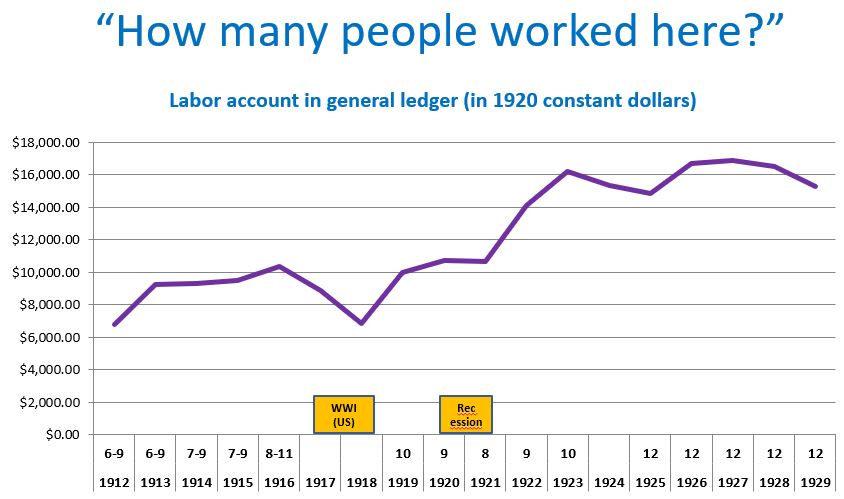 For the years 1915 to 1930, the workforce gradually increased from 7 to 12. This is in keeping with the amount spent on payroll over the same period (adjusted for inflation).