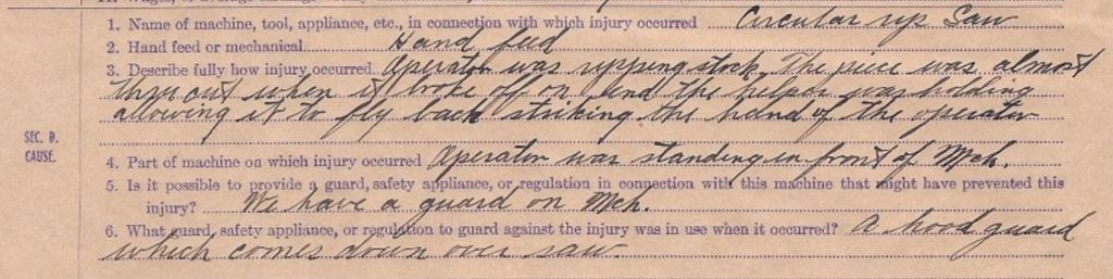 Most machines had guards of some kind, either as part of the purchased machine or manufactured by the Schwambs themselves. But machine guards, even safety glasses which existed, could be dispensed with if they were inconvenient or obstructed a view of the work. The questions “Is there a guard for this machine?” and “Was the guard in place at the time of the accident?” drew a variety of answers from Louis Schwamb as he completed the reports. Indeed, he was not usually a witness to the accident and had to record it as related by the injured worker.