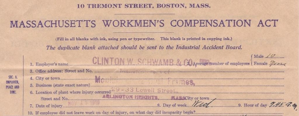People often ask if there were many immigrants working in the Schwamb Mill. The accident reports do not answer this question, but the employee names (Fitzpatrick, Comeau, Gonsalves, Sarnie, Pierce, Tanck, Boudreaux, Camarano, etc.) suggest an ethnically diverse workplace typical of the Boston area in the early twentieth century. Further research in the US Census records would provide a definitive answer.