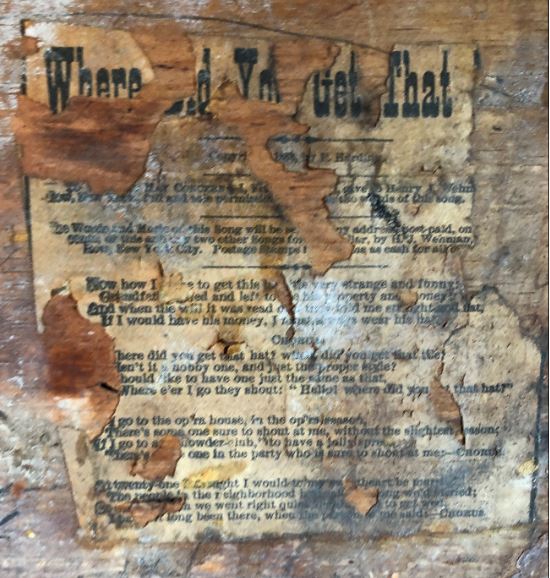The walls also display graffiti, newspaper clippings, poetry and many sheets of lyrics to popular songs of the 1880s and 1890s. (At right, the lyrics to “He’s All Right When You Know Him — But You’ve Got To Know Him Fast.”) The paper ephemera was either glued or varnished to the wooden walls, and has since deteriorated and flaked off after a hundred and thirty summers and winters in the attic.