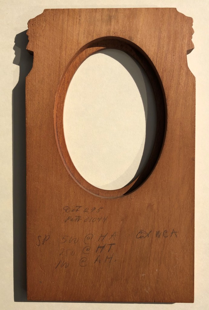 The Shorey Studio remained a customer of the Schwamb mill until at least the 1940s. On November 16, 1931, the Schwambs recorded in their pattern list the newer style panel frame with an oval site and profiles of the Old Man of the Mountain on either side. The dimensions of the oval site and rabbet, and the width of the panel, are exactly those of the earlier gum oval two-piece product.