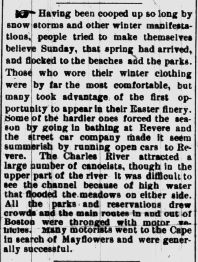 OK, this is not a first snow; in fact it records the last snow of the 1915-1916 season. Readers may recall the sense of resignation they felt in the record season of 2014-2015, when 110.6 inches of snow fell in Boston, and recognize the sentiments expressed in the Advocate: “Six inches of snow fell on Friday, April 28th, was a record breaker. We shall not be surprised at anything now even a snow storm on the 4th of July.” The Advocate noted (at right) that the previous Sunday, Easter was celebrated with a mix of attire, some folks wearing new spring fashions despite the cold, while others stuck to winter coats. The Globe provided the full story: Despite forecasts for mild weather, the temperature that spring evening had dropped to 34-38 degrees. The storm brought the season’s total of snow storms up to an even 30. Over 55 days 87.5 inches of snow had fallen. Importantly, the snow cancelled a Braves – Giants game.