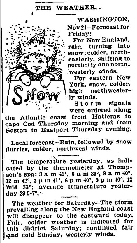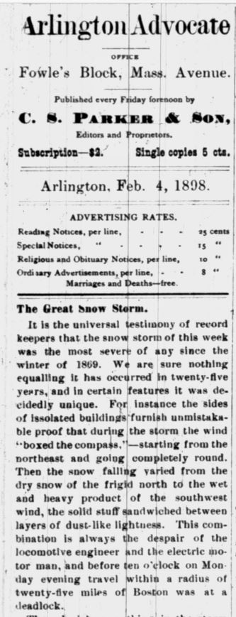 The Advocate commented generally on this Friday storm, noting the children’s half-holidays from school and the nuisance of boys throwing snowballs at passers-by in the center. The Arlington Enterprise, a competing weekly newspaper, noted wryly, “Citizens had their first chance to take a fall Friday morning on snow and ice.” The weather forecast in the Globe (at right) included the Friday storm but gave no hint of a worse one to follow on Sunday.