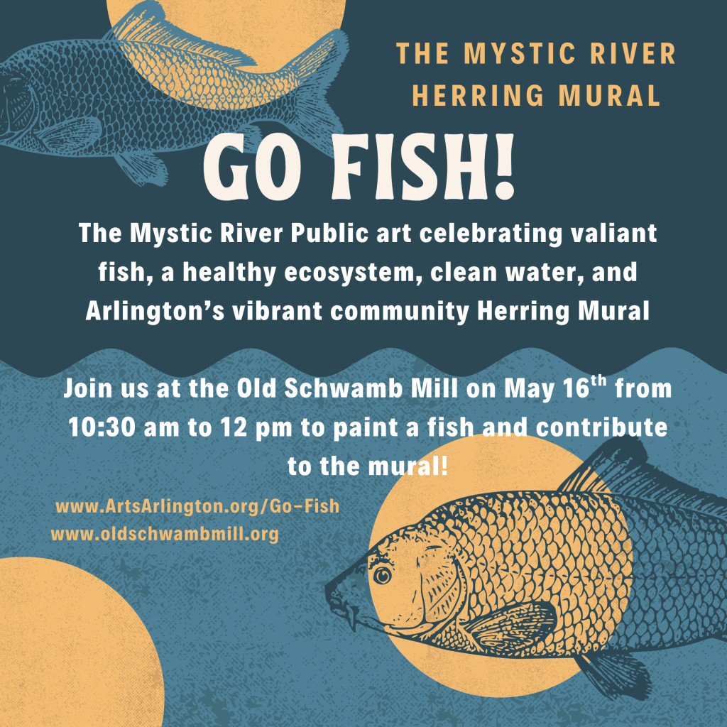 The Old Schwamb Mill is proud to serve as a community workshop host for GO FISH!, a town-wide public art initiative led by ArtsArlington, inviting residents to take part in a collaborative mural celebrating environmental restoration, local waterways, and community creativity.