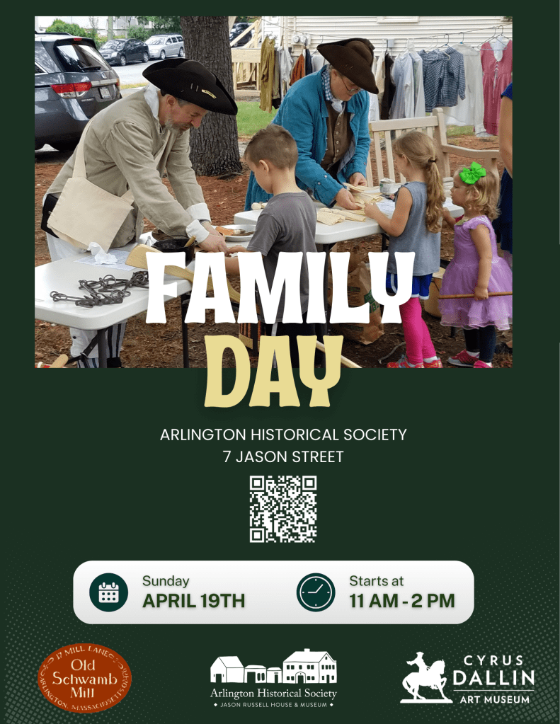 The Old Schwamb Mill invites families and community members to celebrate Patriots’ Day with a special Family Day on Sunday, April 19, from 11 AM to 2 PM at the Jason Russell House (7 Jason Street) with the The Arlington Historical Society and Cyrus Dallin Art Museum.