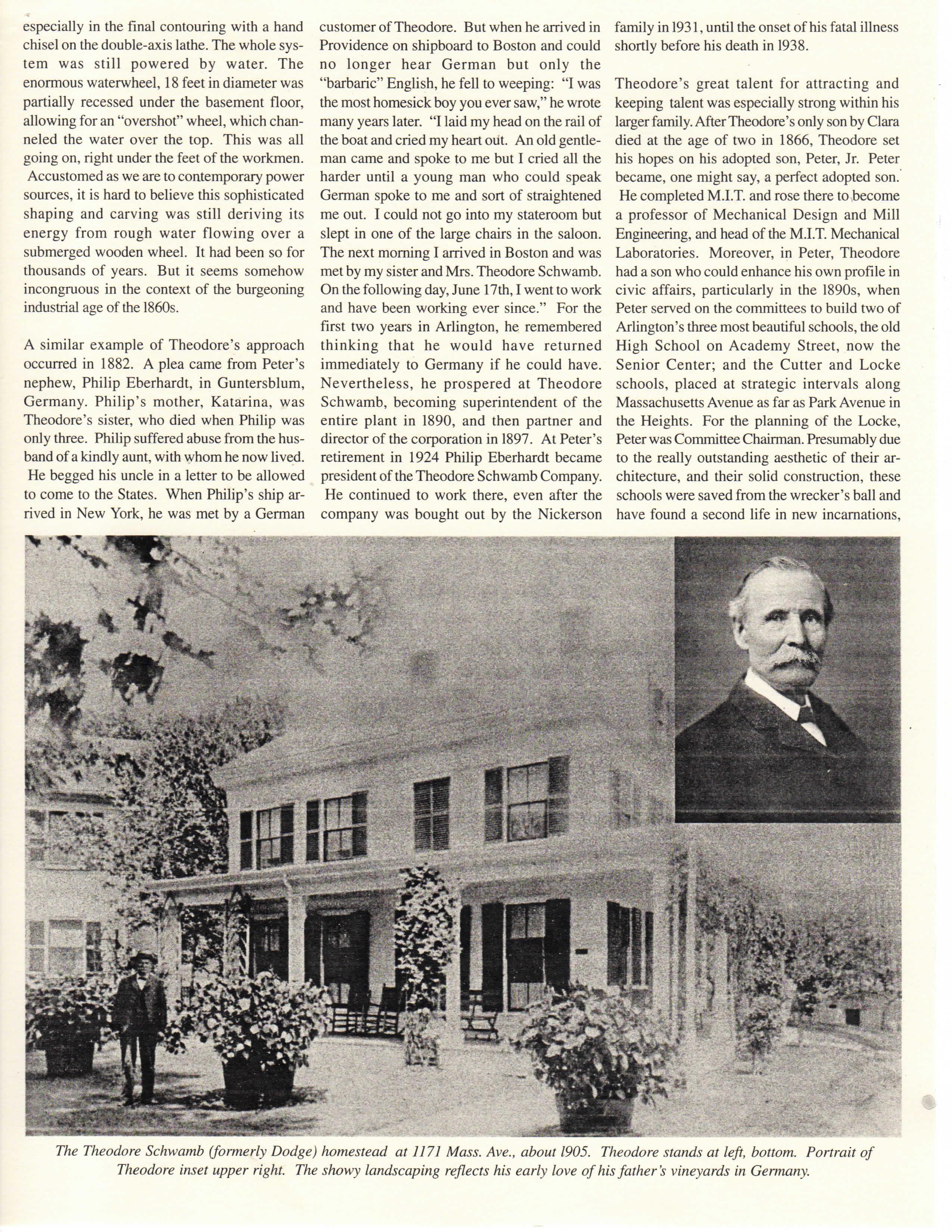 1860 Theodore Schwamb married the widow of his brother Peter. Theodore adopted Peter Jr. who would become a professor and Director of the Mechanical Laboratory at MIT and Treasurer of the Theodore Schwamb Company at 1165-1171 Massachusetts Avenue in Arlington.