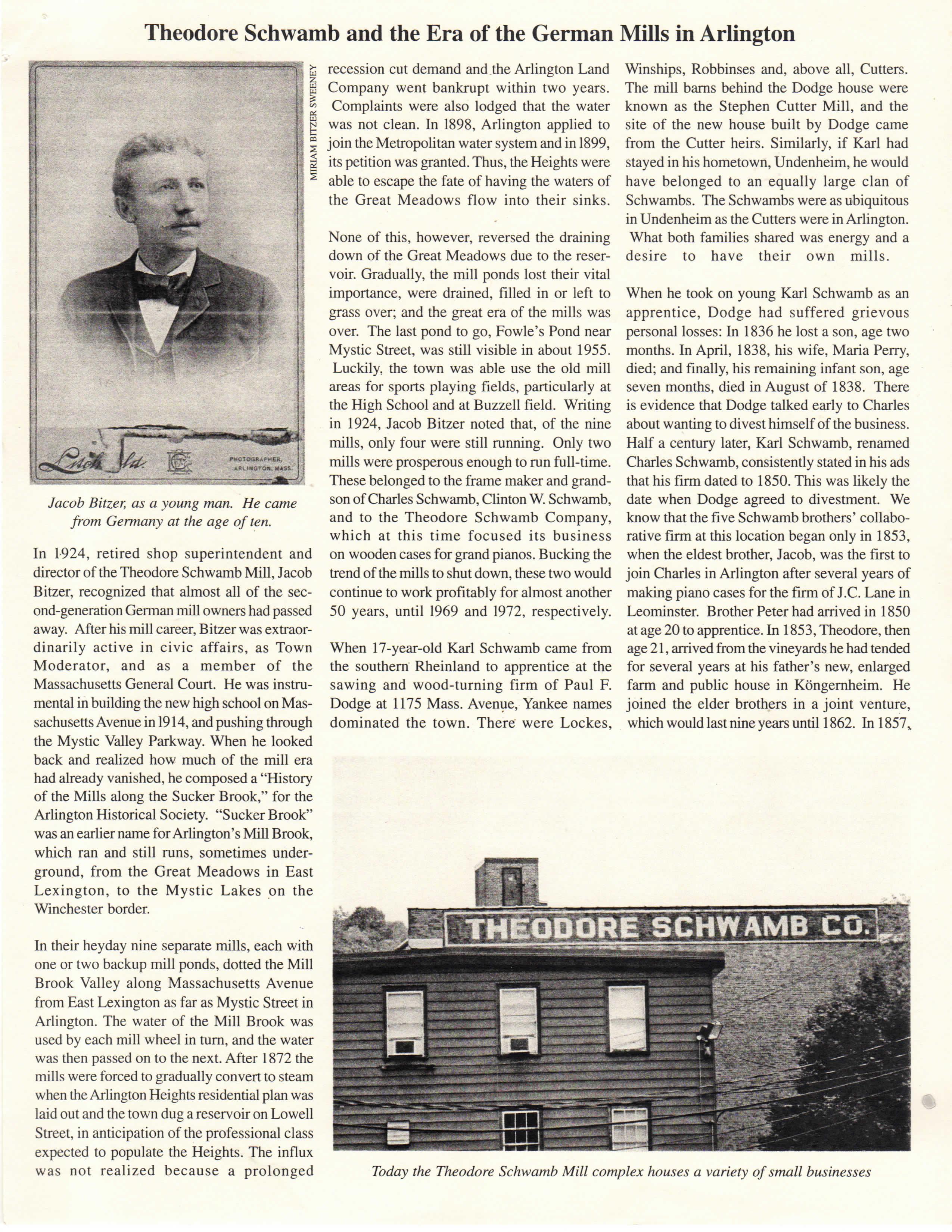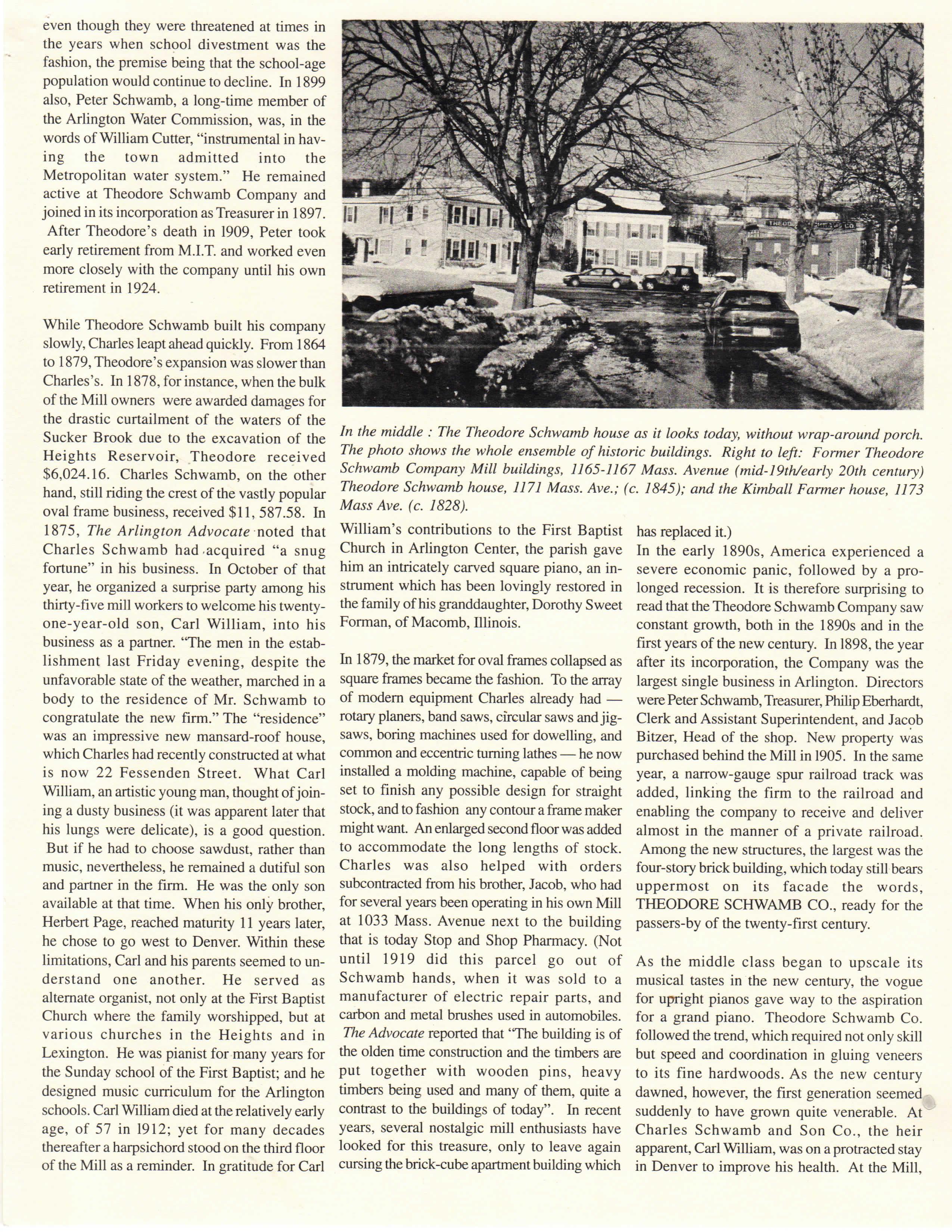 1850 Charles and Jacob Schwamb moved to the Dodge Mill (built by Gershom Cutter) on Mill Brook (1167 Massachusetts Avenue) to make piano cases. They were joined by brothers Peter, Theodore, and Frederick.