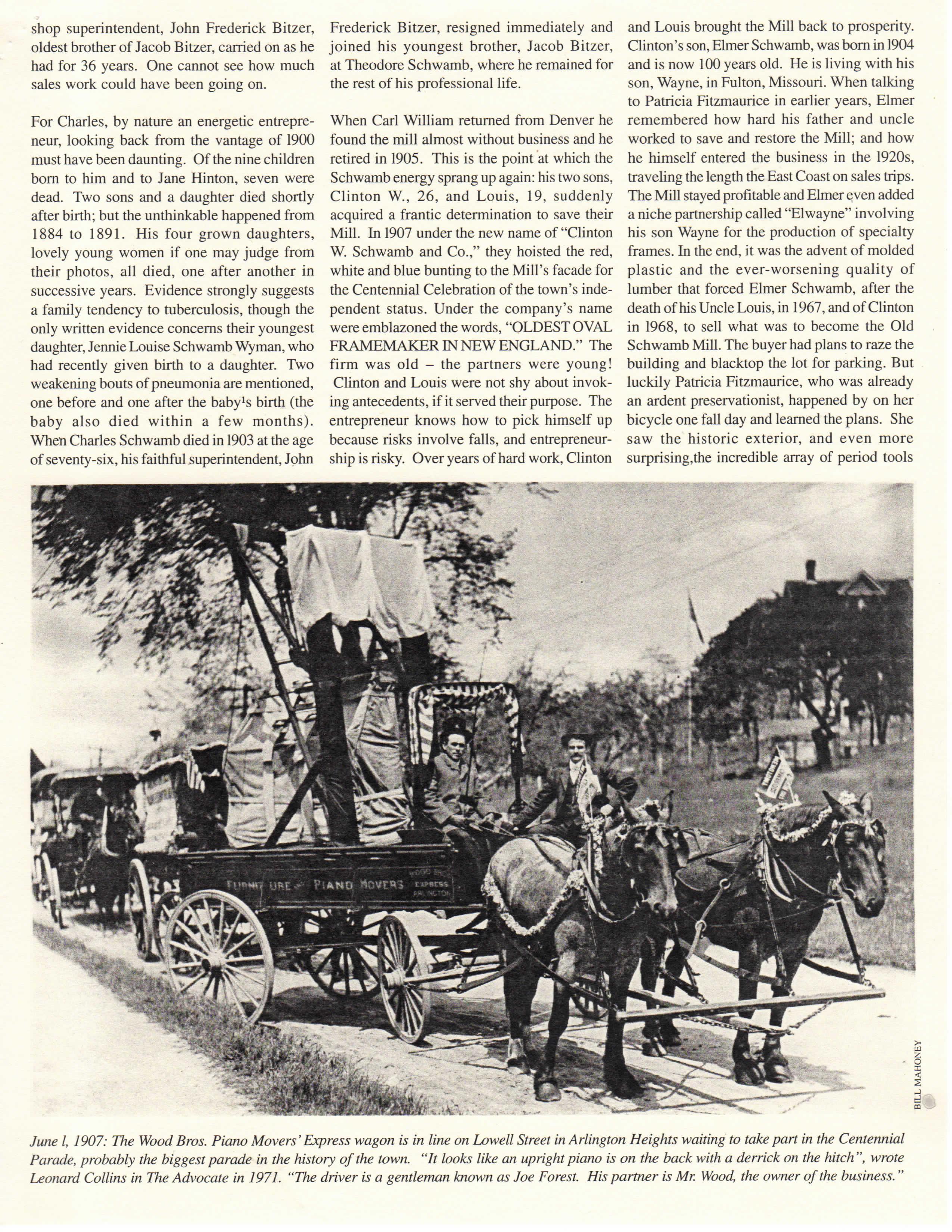 While Theodore Schwamb built his company slowly, Charles leapt ahead quickly. From 1864 to 1879, Theodore’s expansion was slower than Charles’s. In 1878, for instance, when the bulk of the Mill owners were awarded damages for the drastic curtailment of the waters of the Sucker Brook due to the excavation of the Heights Reservoir, Theodore received $6,024.16. Charles Schwamb, on the other hand, still riding the crest of the vastly popular oval frame business, received $11, 587.58. In 1875, The Arlington Advocate noted that Charles Schwamb had acquired “a .snug fortune” in his business. In October of that year, he organized a surprise party among his thirty-five mill workers to welcome his twentyone-year-old son, Carl William, into his business as a partner. “The men in the establishment last Friday evening, despite the unfavorable state of the weather, marched in a body to the residence of Mr. Schwamb to congratulate the new firm.” The “residence” was an impressive new mansard-roof house, which Charles had recently constructed at what is now 22 Fessenden Street. What Carl William, an artistic young man, thought ofjoining a dusty business (it was apparent later that his lungs were delicate), is a good question. But if he had to choose sawdust, rather than music, nevertheless, he remained a dutiful son and partner in the firm. He was the only son available at that time. When his only brother, Herbert Page, reached maturity 11 years later, he chose to go west to Denver. Within these limitations, Carl and his parents seemed to understand one another. He served as alternate organist, not only at the First Baptist Church where the family worshipped, but at various churches in the Heights and in Lexington. He was pianist for many years for the Sunday school of the First Baptist; and he designed music curriculum for the Arlington schools. Carl William died at the relatively early age, of 57 in 1912; yet for many decades thereafter a harpsichord stood on the third floor of the Mill as a reminder. In gratitude for Carl William’s contributions to the First Baptist Church in Arlington Center, the parish gave him an intricately carved square piano, an instrument which has been lovingly restored in the family of his granddaughter, Dorothy Sweet Raman, of Macomb, Illinois.